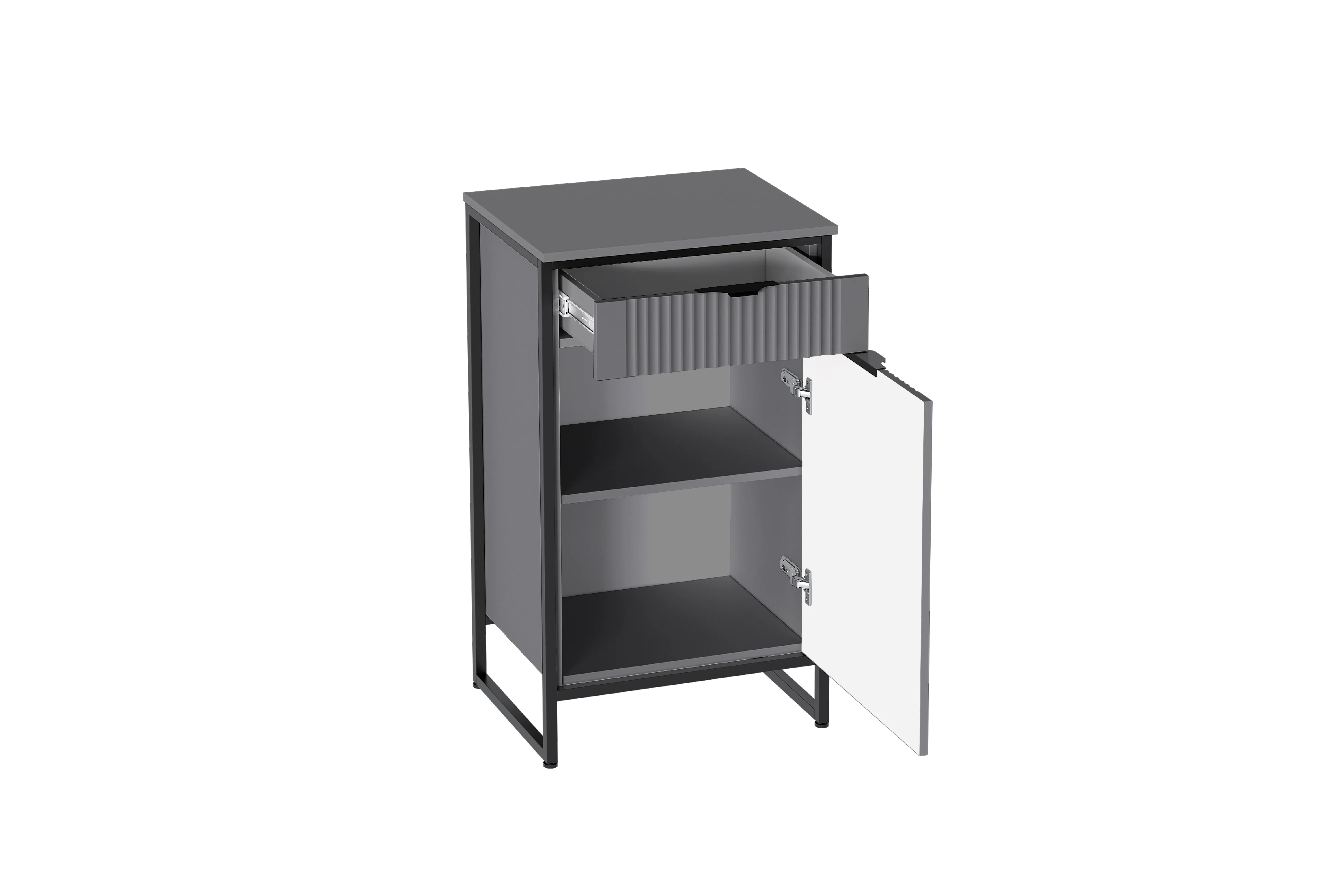В верхней части тумбы "Нора" установлен выдвижной ящик на шариковых направляющих с доводчиками. Нижняя часть тумбы закрыта распашной дверью, за которой установлена съемная полка. Дверь может устанавливаться как на правую, так и на левую сторону и оснащена петлями с доводчиками.