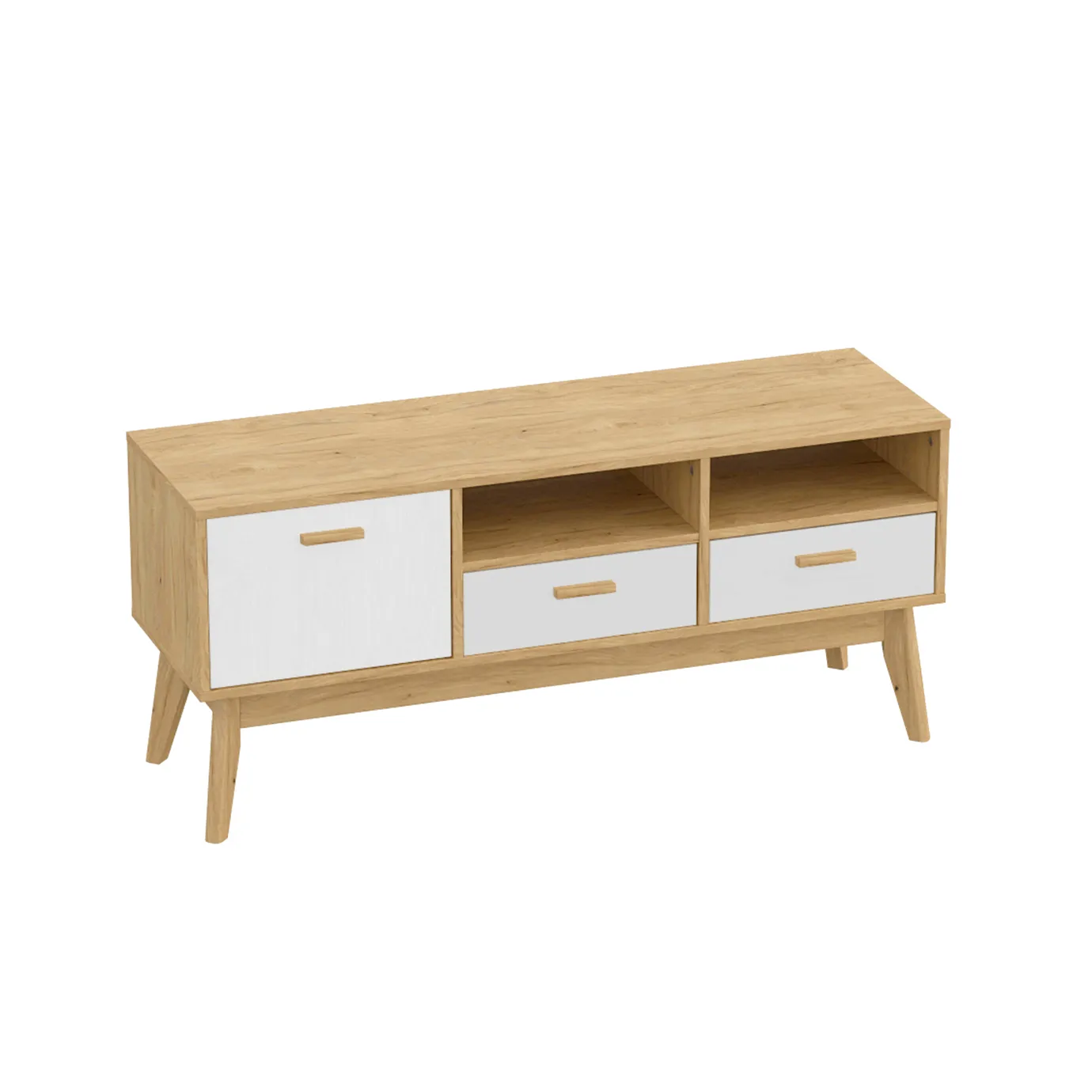 Упорядочить хранение сопутствующих аксессуаров и компонентов домашнего кинотеатра помогут выдвижные ящики с фасадами из белоснежного МДФ, секция с распашной дверцей и открытые ниши. Корпус изделия выполнен из ЛДСП, высокие стильные опоры и ручки - из массива березы.